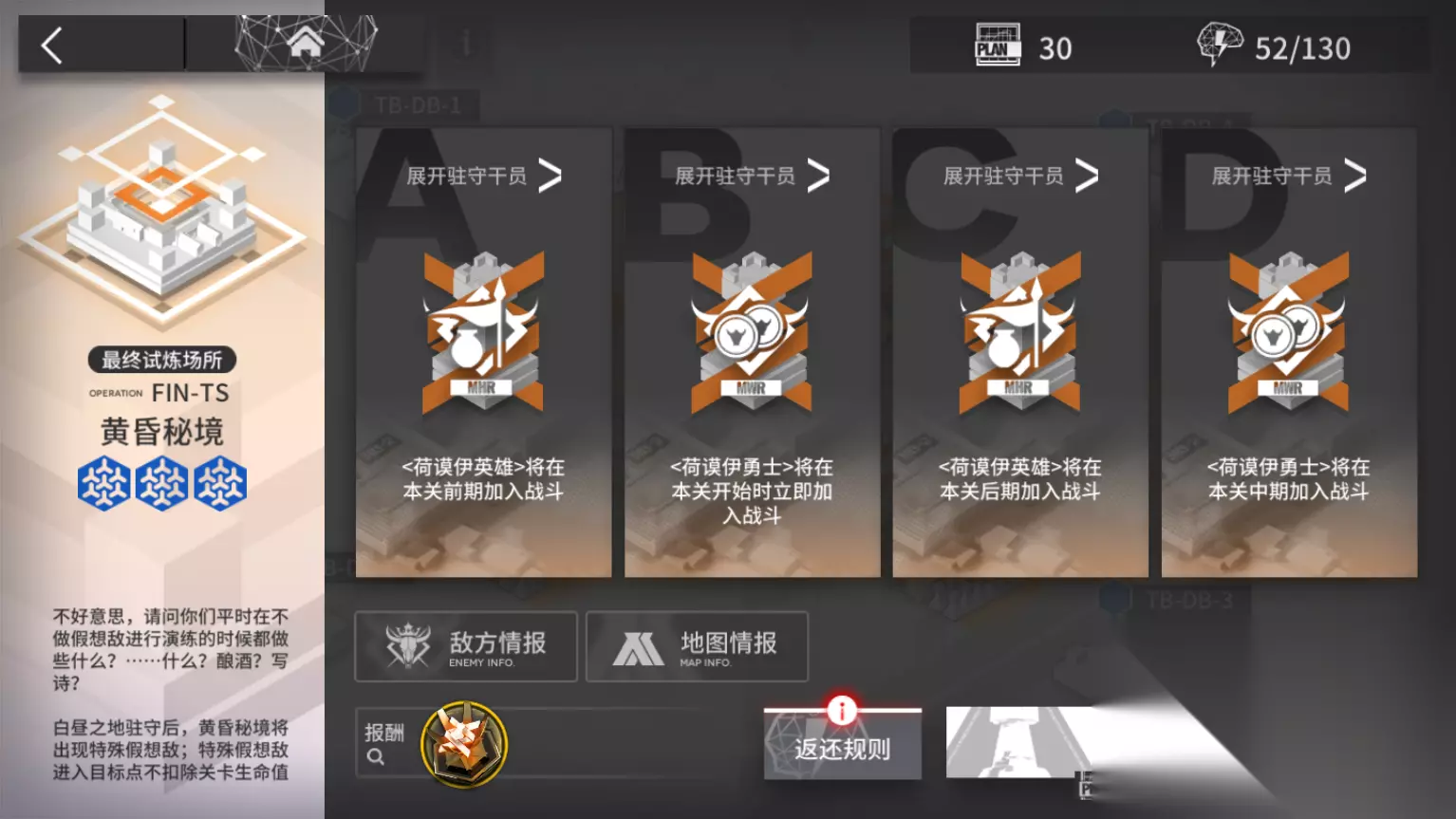 当内层的四个关卡都选择留守干员后,最终关卡FINTS会在原有敌人的基础上出现两个荷谟伊英雄和荷谟伊勇士,同时关卡通过后的活动材料也会多掉落四个,在很大程度上节省了大家刷取材料的时间。但是四个关卡都留守会很大程度上削减我们干员的整体实力,大家需要根据自身的练度合理进行选择。