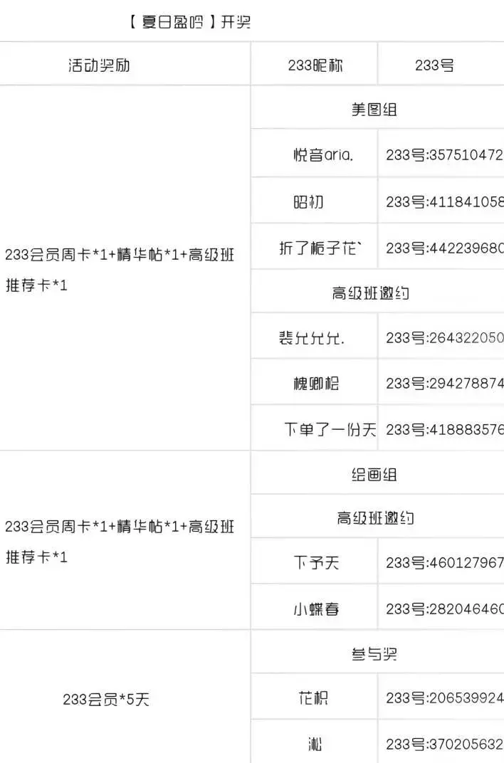 绘画组(5人):233会员周卡*1+精华帖*1+高级班推荐卡*1