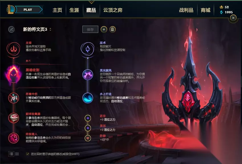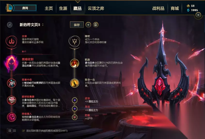 首先在天赋选择上就有很多种,都各有其作用,小miu来一一介绍吧。在主系天赋方面差别并不大,以黑暗收割恶意中伤为主的一套主宰系天赋,点出终级猎人,让R技能变得更加的快。