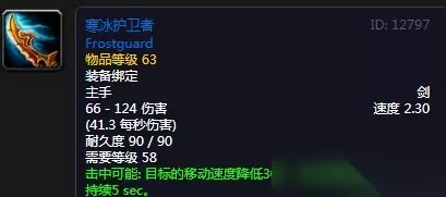 魔兽世界怀旧服寒冰护卫者 装备效果: 攻击66-124 2.3速度 需要等级 58 效果:击中可能使目标移动速度降低30%,攻击速度降低25%,持续5秒。