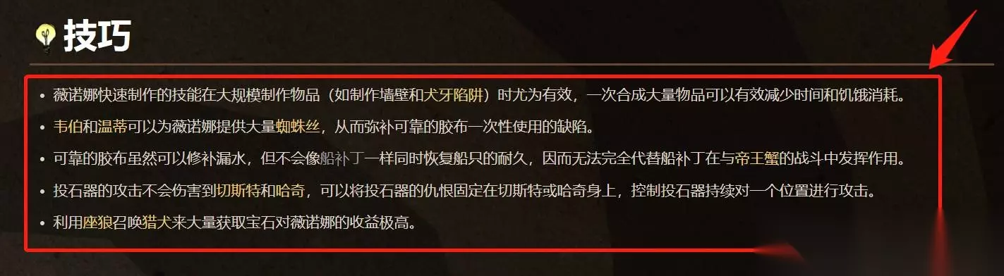 3、薇诺娜可以免疫查理的攻击,免疫来自黑暗的第一次攻击,这样薇诺娜不会因此损失生命或理智,薇诺娜每次回到光照下都可以刷新这个效果。