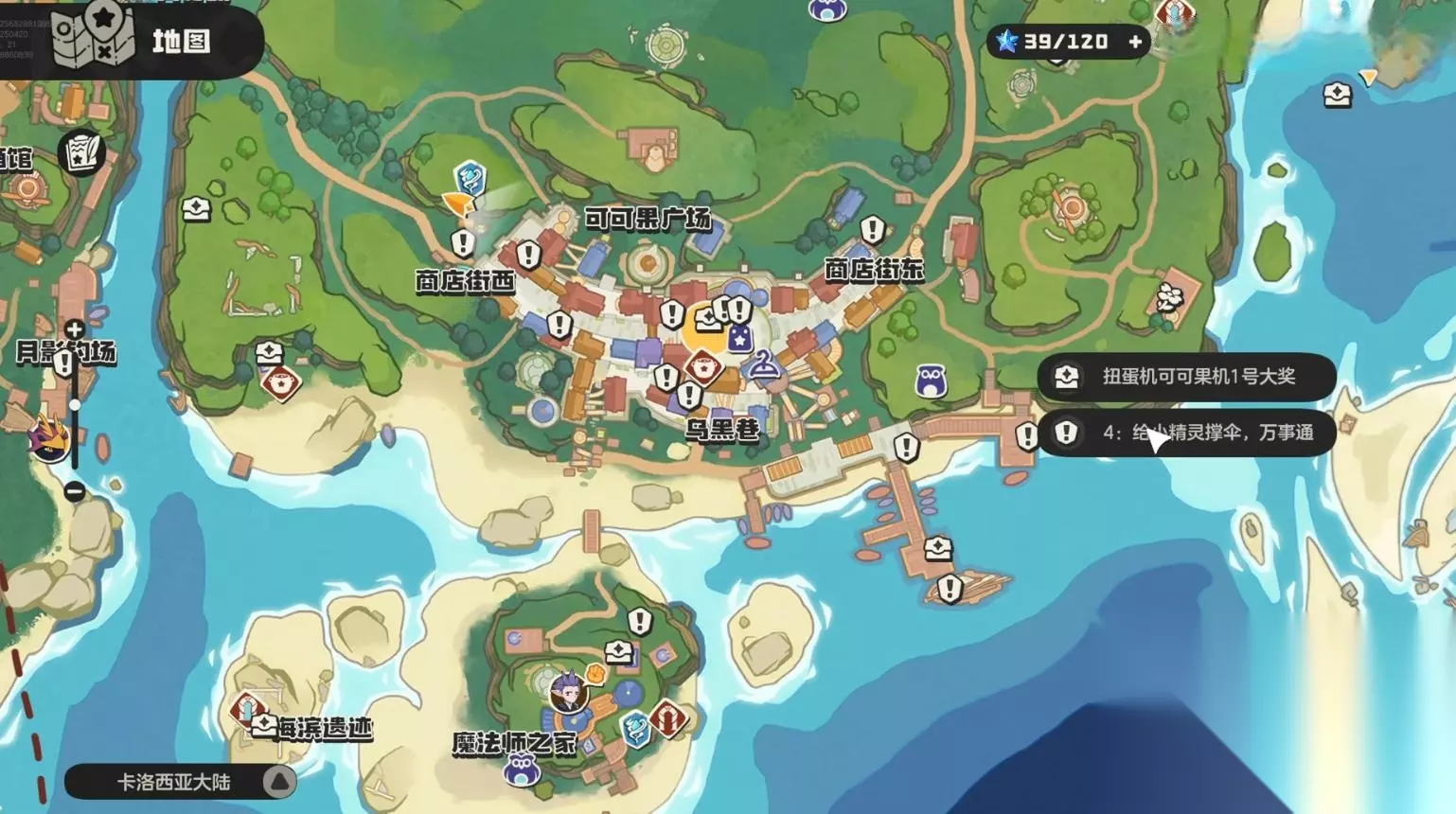 在可可果广场附近可以完成任务获取奖励,可以找到给小精灵撑伞的任务,对话按照要求给相应的精灵撑伞就能完成奖励获取成就,还有场景的互动,需要携带相应的精灵,可以击打鼓完成任务之后领取宝箱道具。
