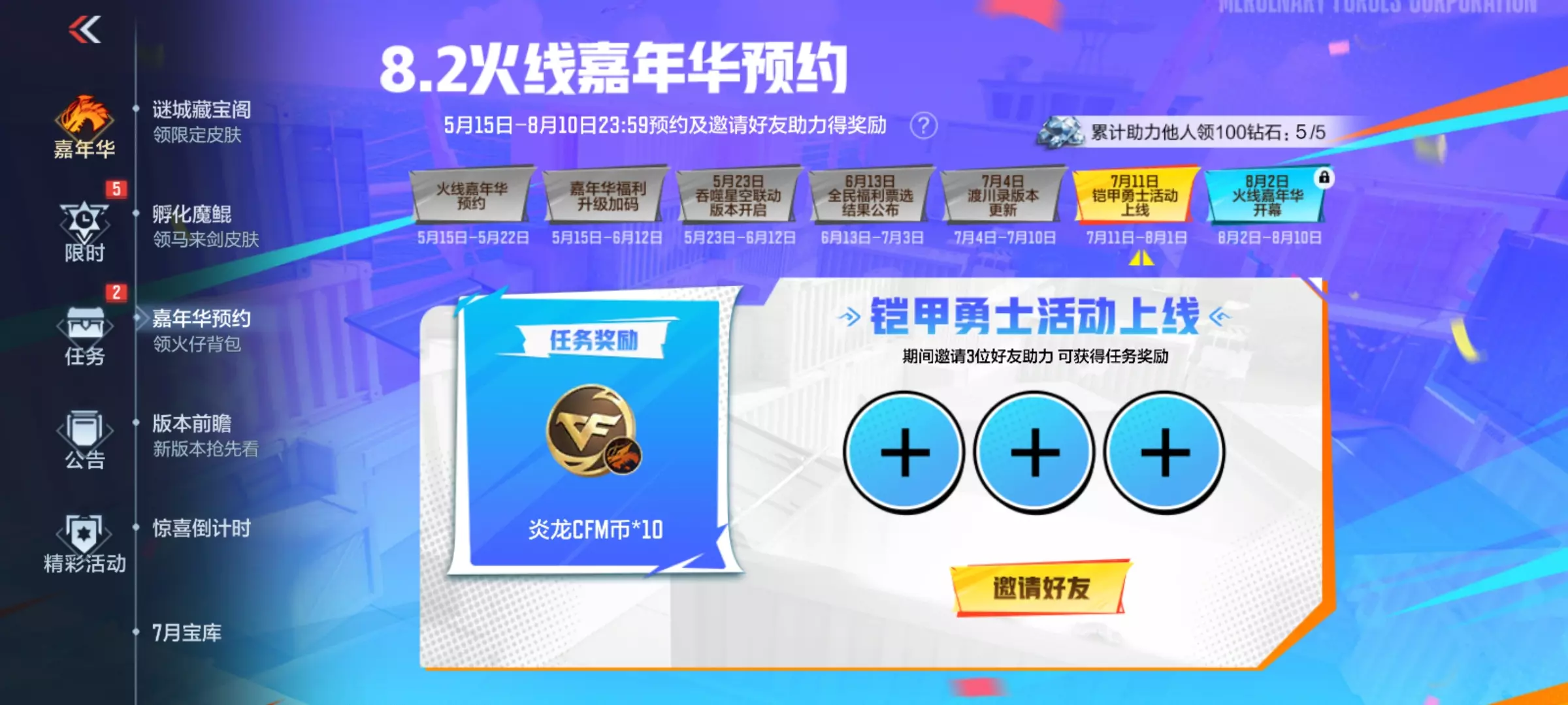 嘉年华预约活动正在火热进行中,邀请3位好友助力,可获得热门道具炎龙CFM币*10。该道具能够在CFM币商城中兑换烈焰弓、烈焰刀等稀有武器,有需要的小伙伴一定不要错过。