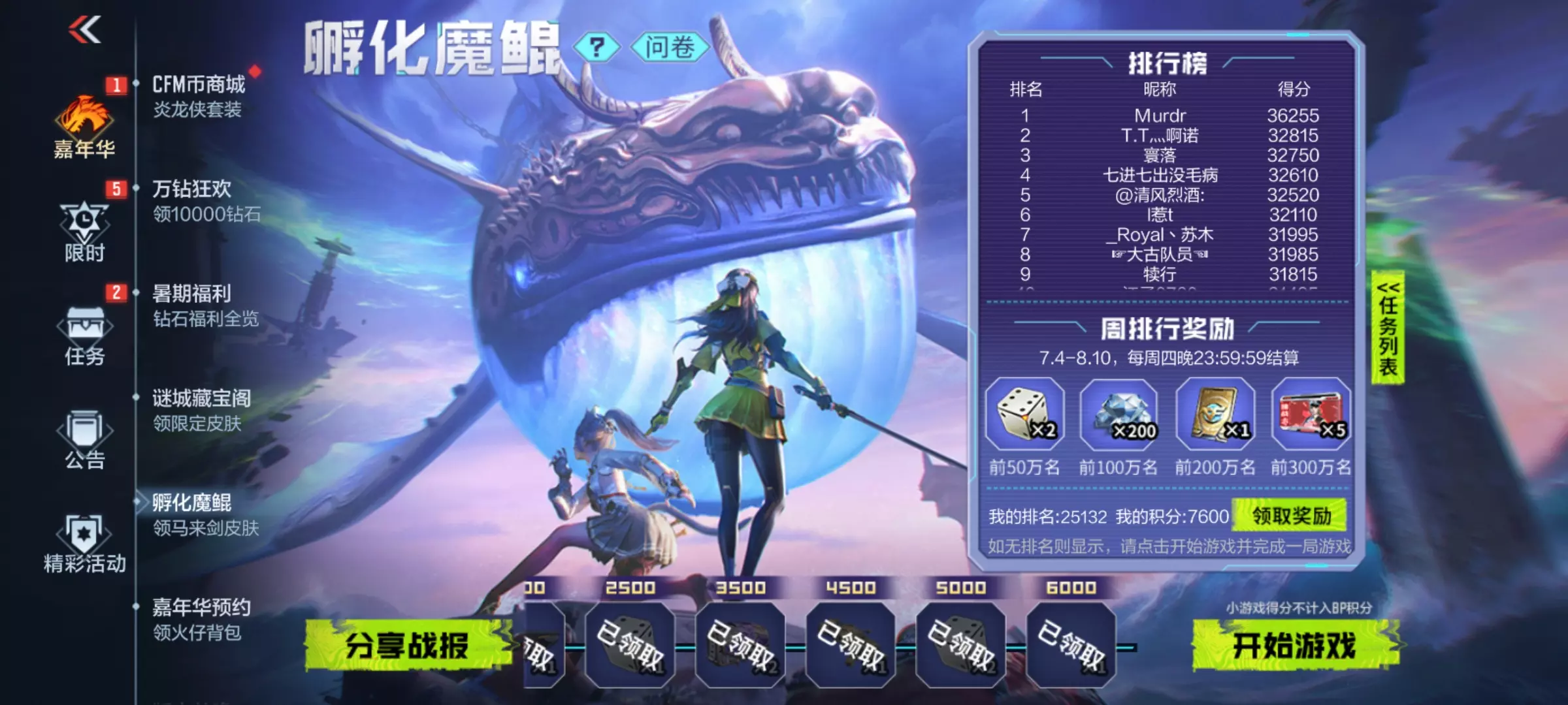 孵化魔鲲小游戏大家都参与了吗?第一周奖励已经发放,接下来开始冲刺第二周的奖励,千万不要忘记参与小游戏冲榜。除此之外,完成生化大战场的相关任务后可解锁多种奖励,更有稀有皮肤马来剑-毁灭-现代金属等你来拿。