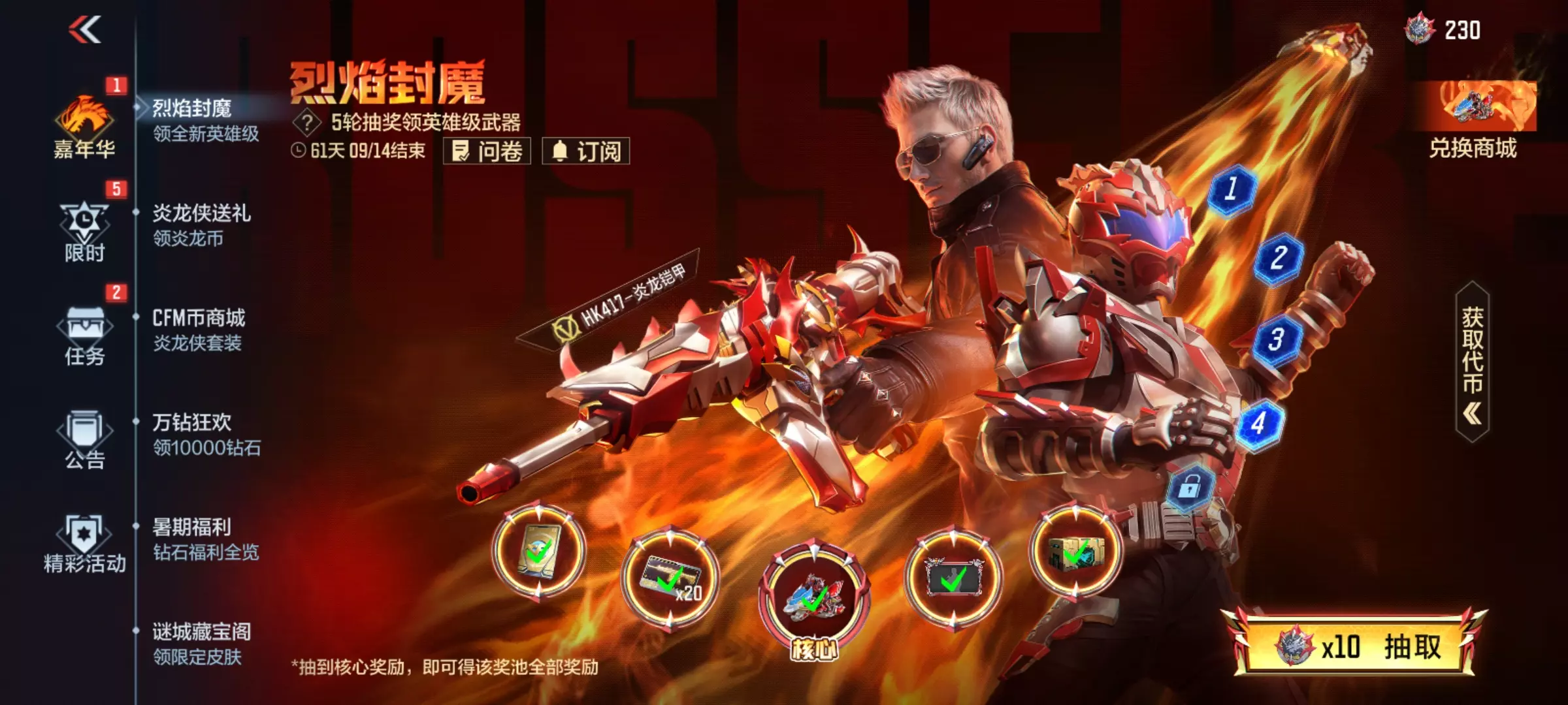 全新英雄级武器免费送,活动期间完成五轮抽奖后,即可获得铠甲勇士联动的武器HK417-炎龙铠甲,不过需要等到8月2日才能进行觉醒哦。除此之外,兑换商城中还有诸多武器道具返场,有需要的小伙伴可以优先兑换。