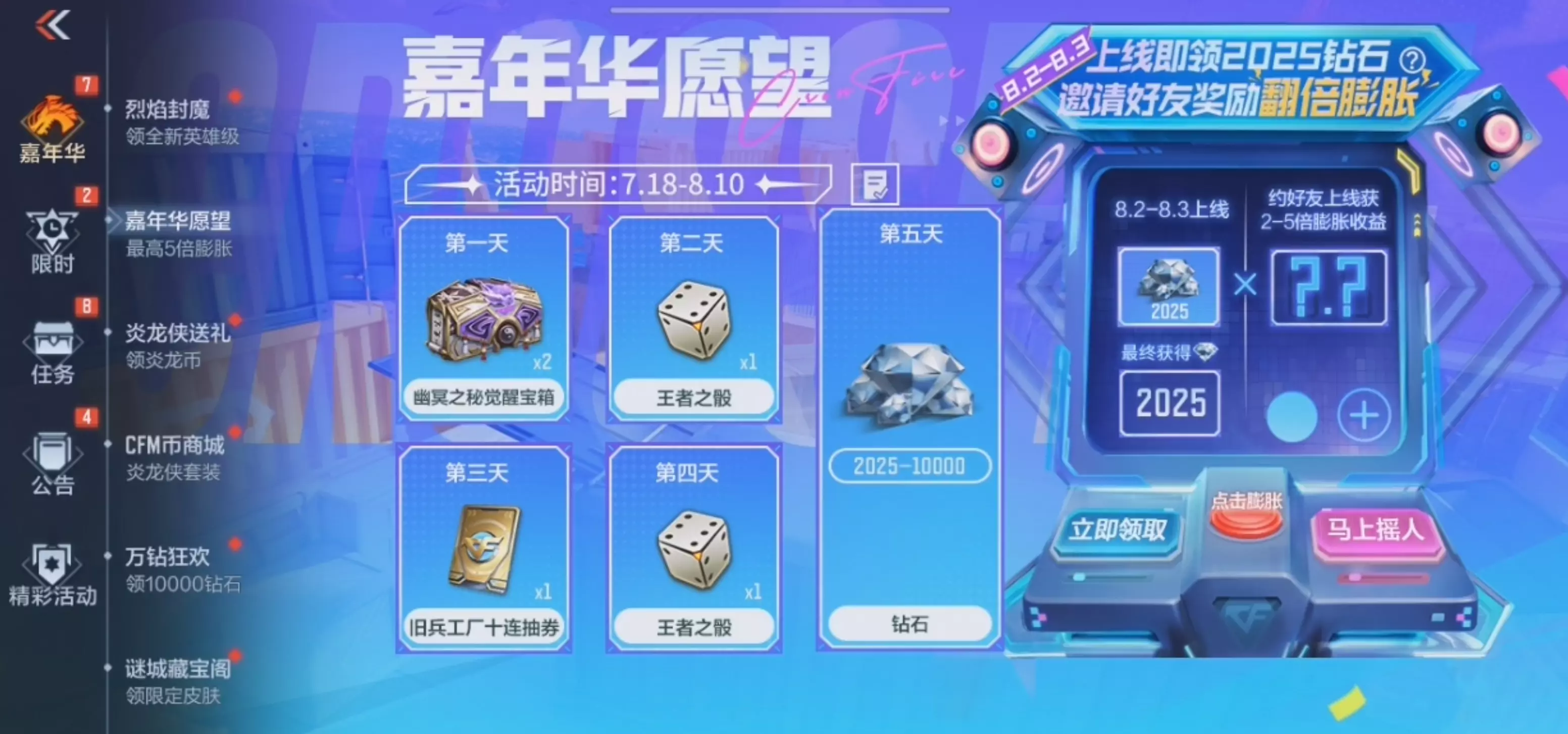 嘉年华愿望火热开启,好友相约钻石膨胀最高5倍!活动期间达到累计签到天数即可领取相应的奖励,签到第五天领2025-10000钻石。不仅如此,8.2-8.3登录还有保底2025钻等你领,而如果你邀约了好友结伴,还可以享受钻石膨胀资格,保底2倍膨胀,即领2025*2=4050钻石,最高5倍膨胀,可得10125钻石!