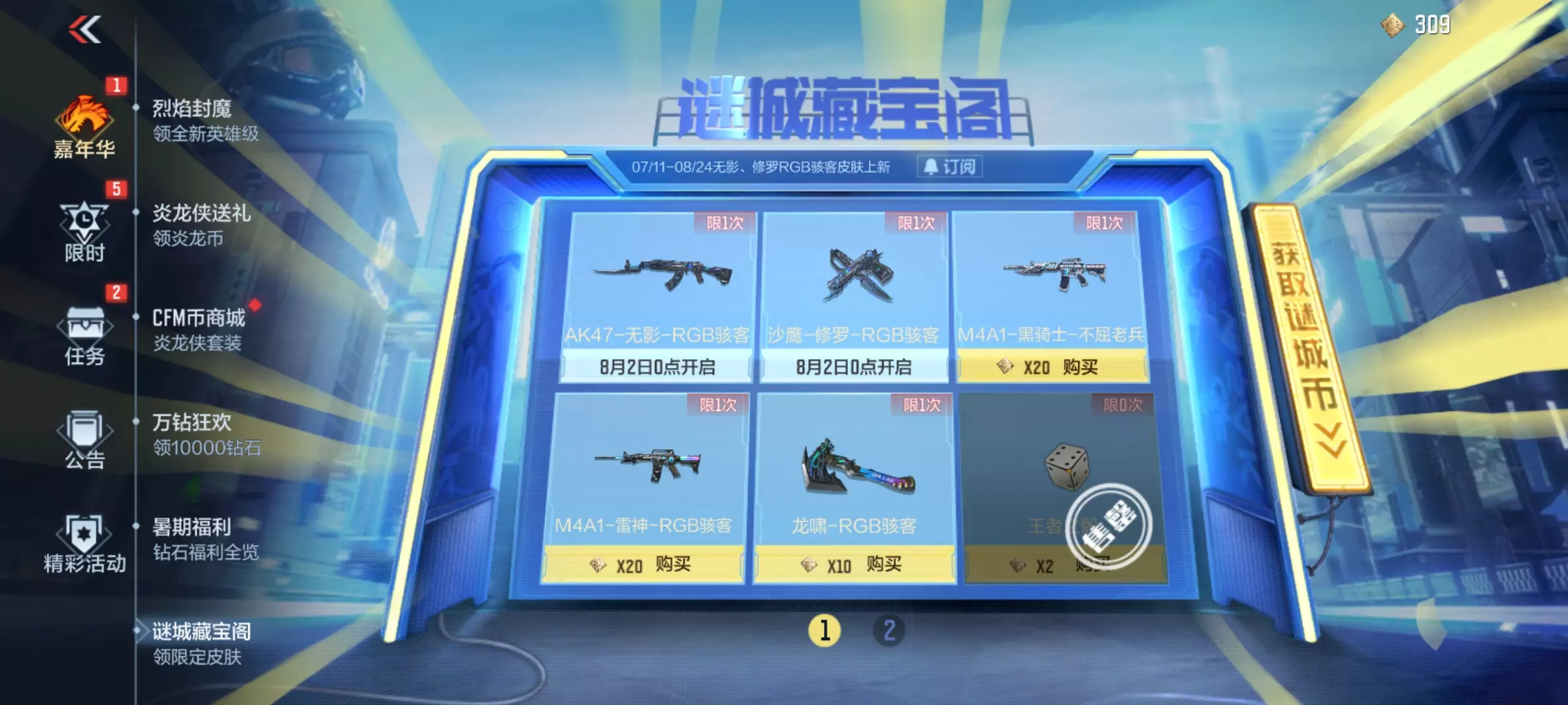 谜城藏宝阁再度开启,这一次不仅返场多款不屈老兵系列皮肤,而且还上架了全新的皮肤AK47-无影-RGB骇客、沙鹰-修罗-RGB骇客。这两款需要8月2日才能开启兑换,小伙伴们一定要记得完成任务收集谜城币哦。