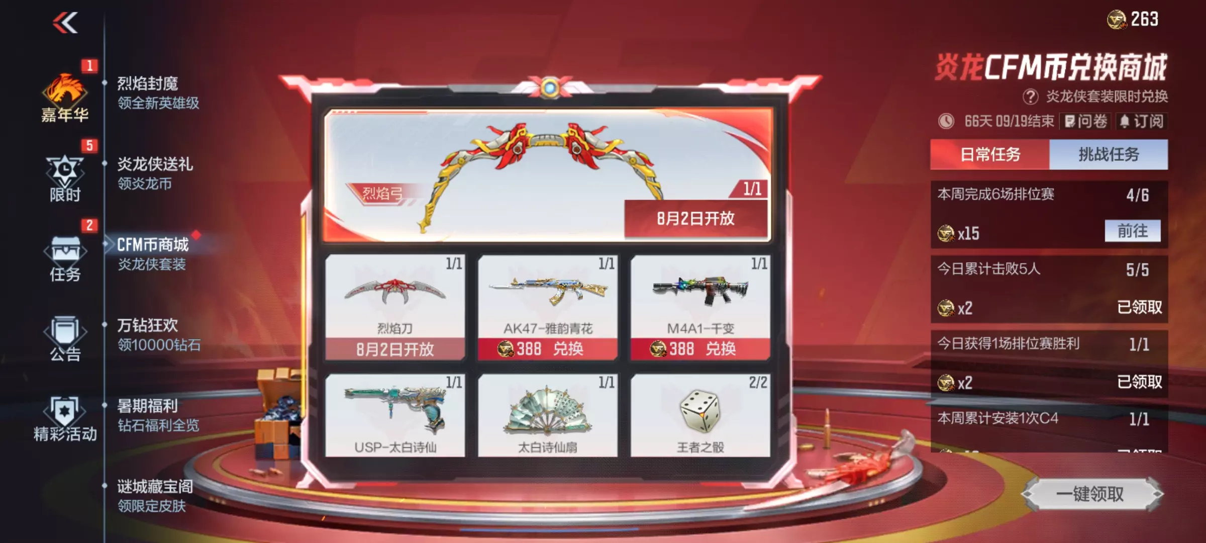 入手了炎龙侠套装中的主武器,岂能少了副武器和近战武器。完成日常任务和挑战任务收集炎龙CFM币,可兑换USP-太白诗仙、太白诗仙扇等,烈焰弓以及烈焰刀在8月2日开启兑换,喜欢的小伙伴请耐心等待。