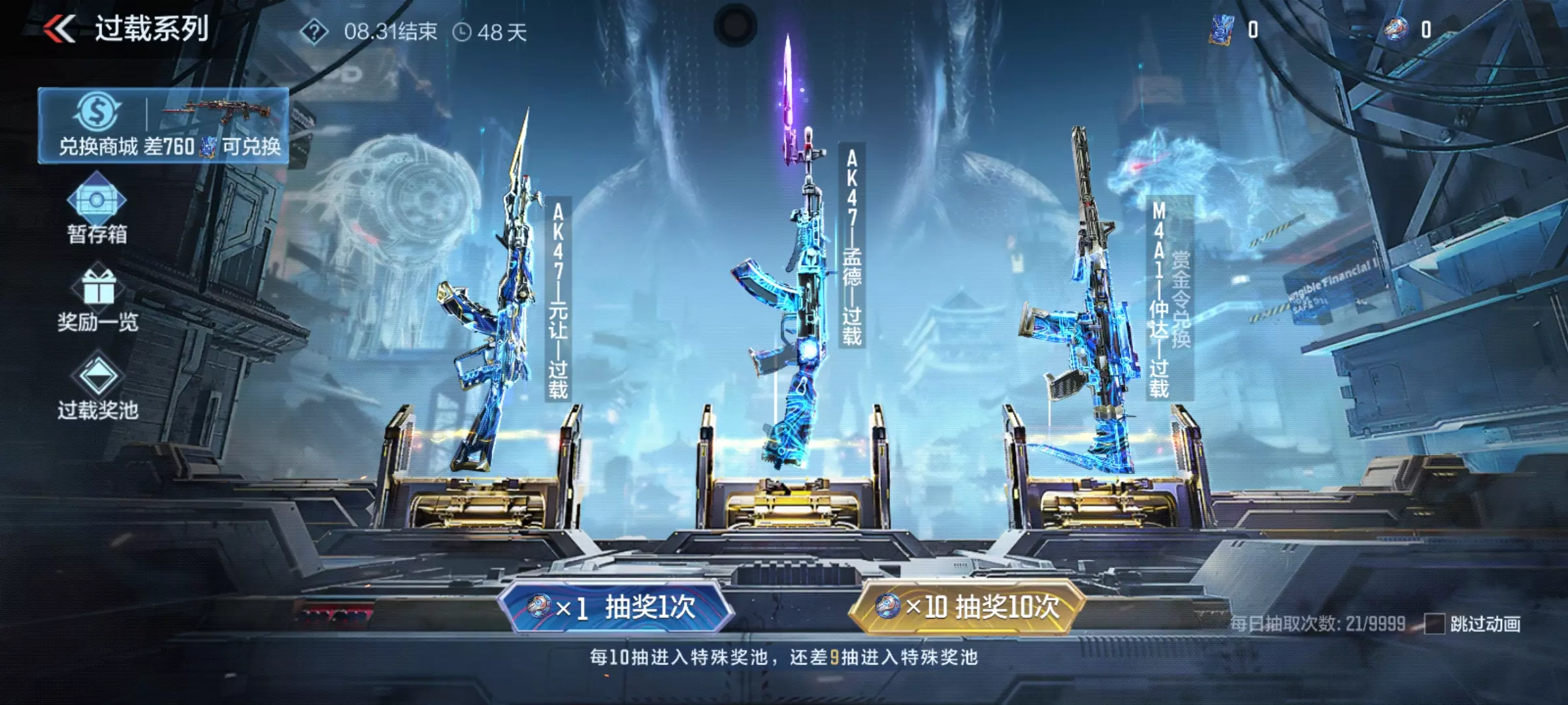 备受期待的过载夺宝终于上线,本次活动中首发元让系列过载万化,如AK47-元让-过载、双持沙鹰-元让-过载等;同时魏国系列武器AK47-元让、AK47-孟德也加入奖池。而另一把魏国武器的过载皮肤:M4A1-仲达-过载,也是在赏金令兑换商城中限时返场,喜欢的小伙伴可不要错过哦。