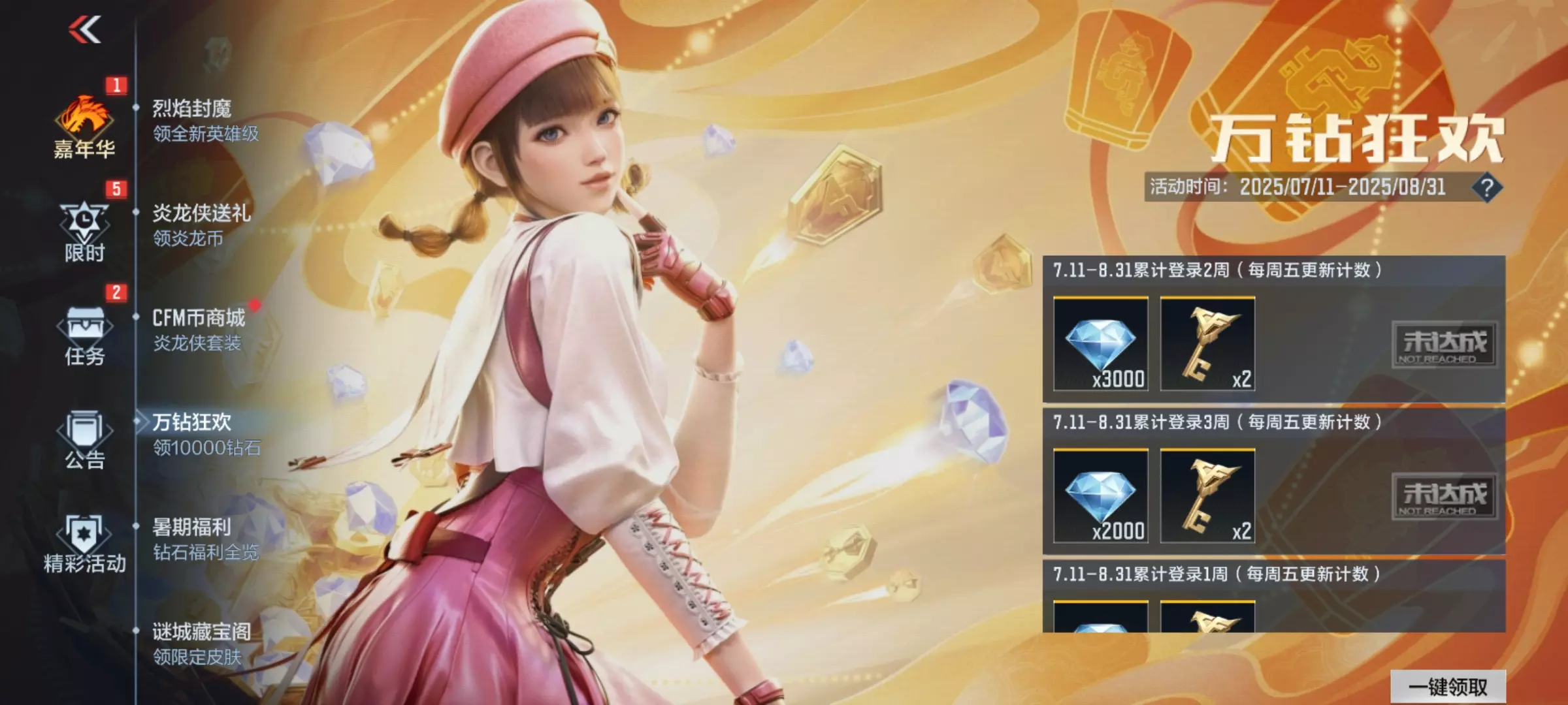 活动期间每周登录可分别领取大量的钻石和英雄之钥,累计完成三周登录后,共计10000钻石和6把英雄之钥等你来拿。帝皇夺宝马上就要来了,一定要记得积攒钻石,才能在第一时间拿下帝皇套装。