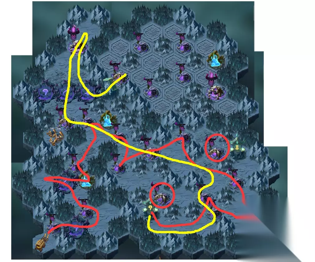 首先遵循红色路线图。不要杀死红圈内的两个硬怪物。走完红色路线,得到老祖宗的加持后,我就在考虑要不要杀他。你可以尝试一下。一旦看到死者,只需单击“暂停”即可退出战斗。不会有任何损失。拿一个笔记本,记下来。杀完之后,沿着黄色路线走就可以了。