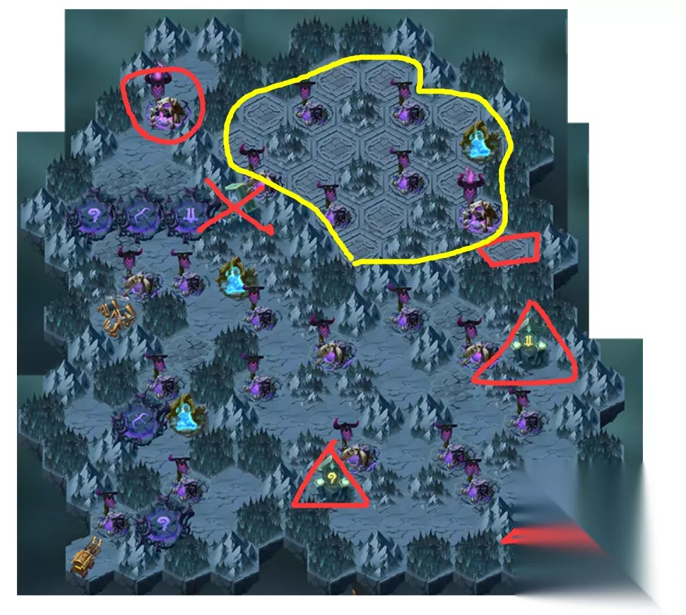 古墓之谜并不是很难。我们先从上面的解释开始吧。请看图片来理解。黄色区域一开始是无法进入的。可以通过红十字会进入,但有条件。门上写着:只有得到祖先庇佑的勇敢者,才能打败强大的敌人,继续前行,赚到的钱就像死了一样。简单的意思就是获得先祖的祝福并击杀红圈的boss即可进入。下面将贴出图片。祖先的祝福位于图中的红色三角形内。每次点击都会出现
