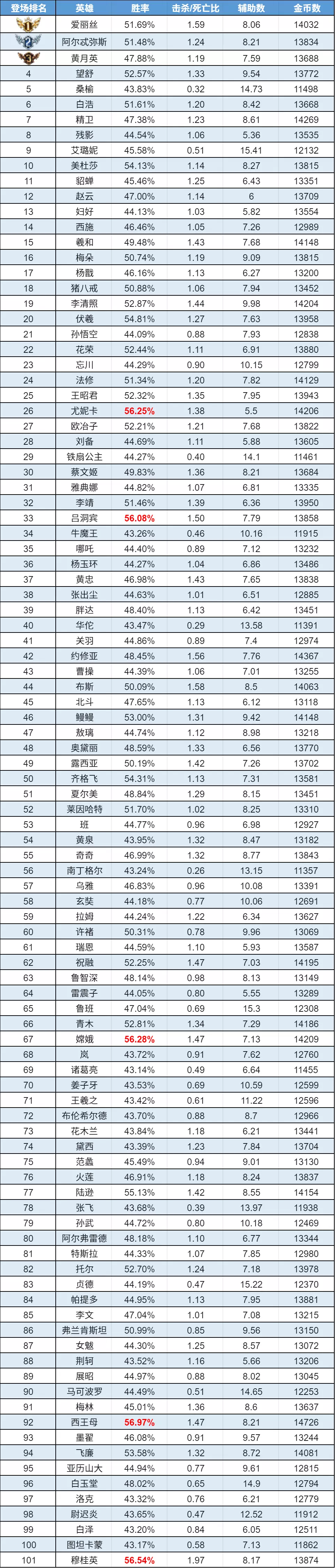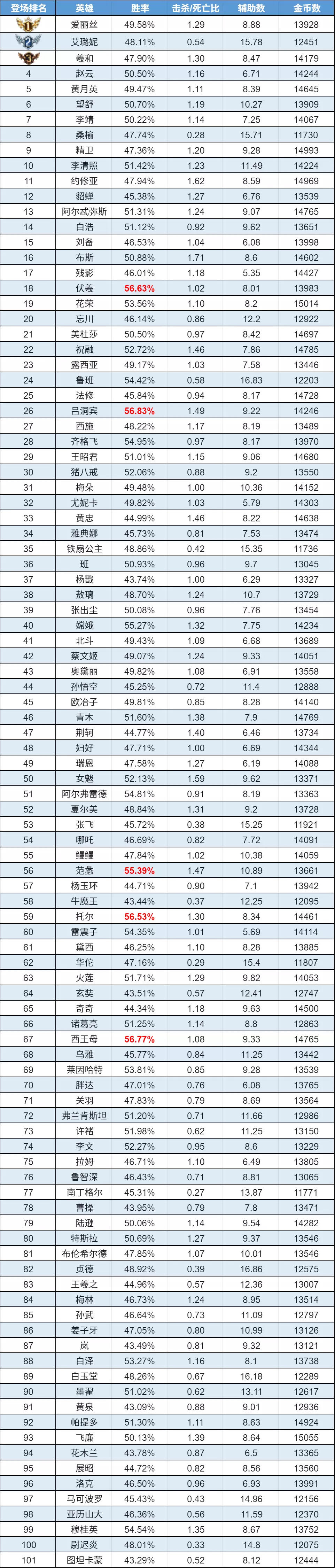 排序:按登场率高低排序,标红为胜率前5