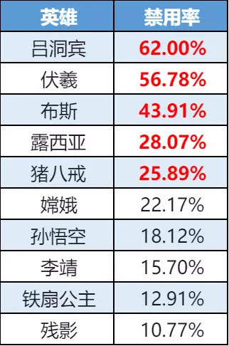 禁用率榜-吕洞宾禁率小幅上升,布斯有所回落