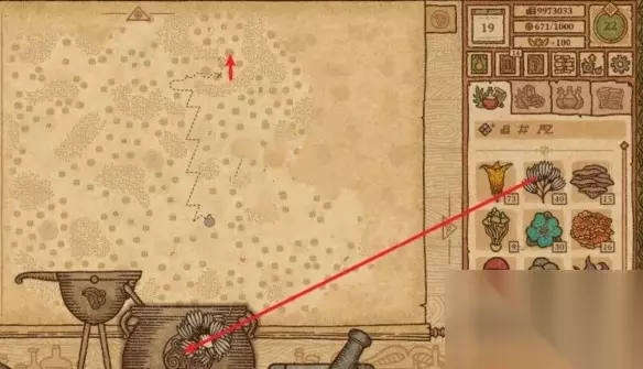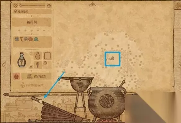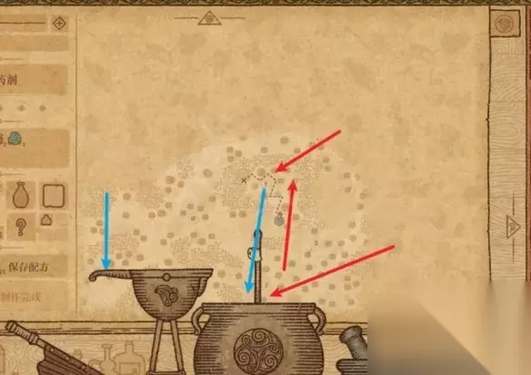 6 、拖动1个火铃铛到研钵中研磨,然后放入坩埚中,使药剂瓶的移动路线向左。 7 、剂瓶的移动路线规划完毕,用鼠标拖动勺子,进行搅拌,搅拌的同时,药剂瓶图标会按照路径移动。当药剂瓶移动到图示位置之后,停止搅拌,拖动左侧的高脚杯,往坩埚里加水,此时药剂瓶会从现在的位置往初始位置直线移动。