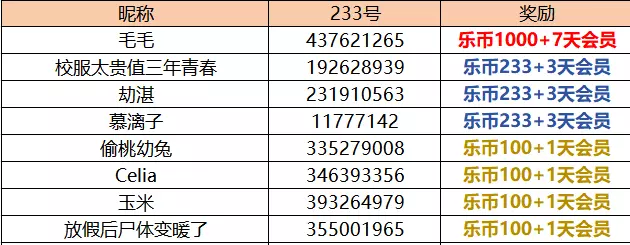 随机抽取3名生存者,送出233乐币+3天会员