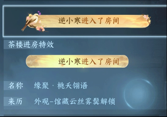 【云丝雾鬓】(天赏)奖励中的:【进房通知:缘聚·桃夭翎语】、【动态头像·焚夜歌】