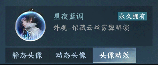 比如,【云丝雾鬓】(天赏)达到条件后,可以选择解锁【动态头像·焚夜歌】或【动态头像·阆风吟】 。