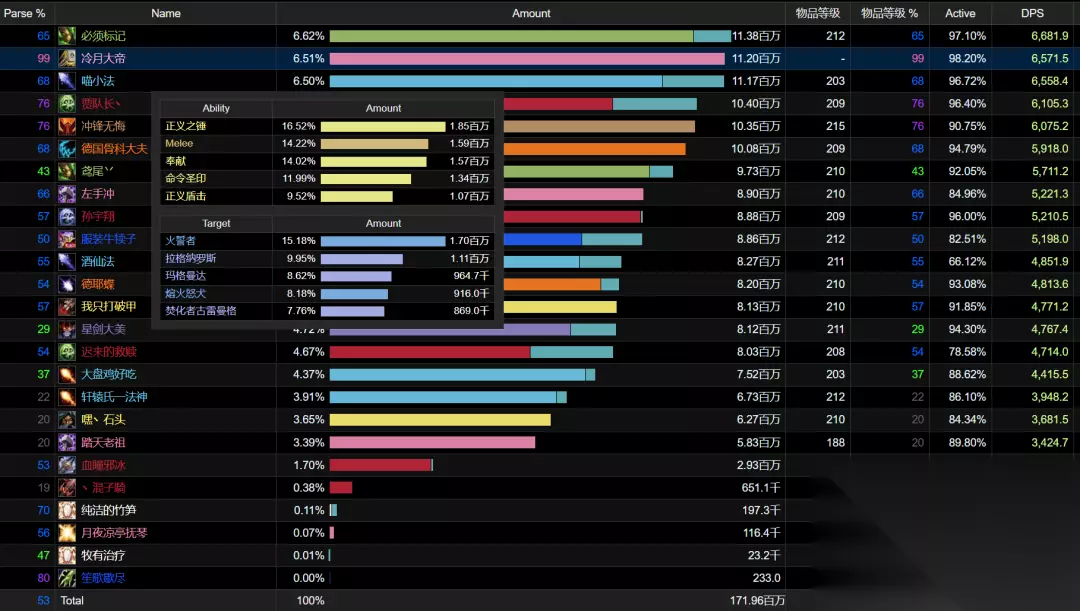 而文中所说的最后按坦克的伤害输出作为分金线,确实也是有不少金团这么操作,也就是“打不过T的不分金”。不过现在看来,有时候想打过T也并不容易。我们来看一下这位DPS拉满的风剑防骑,他的全程伤害在团队中排名第二,只有一名生存猎的伤害水平超过了他。风剑防骑AOE起来真的是不讲道理,打不过非常正常!