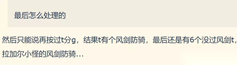 根据玩家的说法,最后这个团因为能分金的人太少,就改了说按照dps比T高的可以分金。最终结局是有6个人dps没有打过风剑防骑,没有分到金。