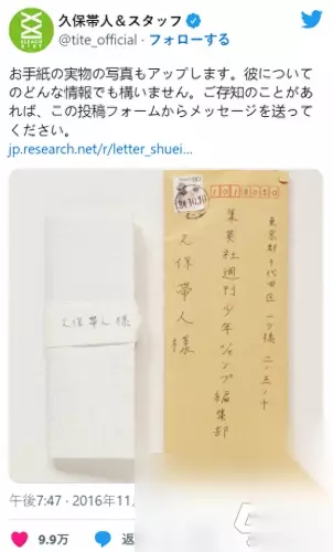 信中写道:“因为想着要看到《死神》的下一卷,我从住院以来第一次开始期待明天的到来” 在信的最后,久保才得知这封信是由他人代寄,男孩已经不在人世。这封信成为了久保画完《死神》的精神动力。 久保还向网友征集了寄件人的线索,希望能有机会向相关人士表达谢意,并在一年后找到了代为寄信的当事人——逝世男孩当时的病友。