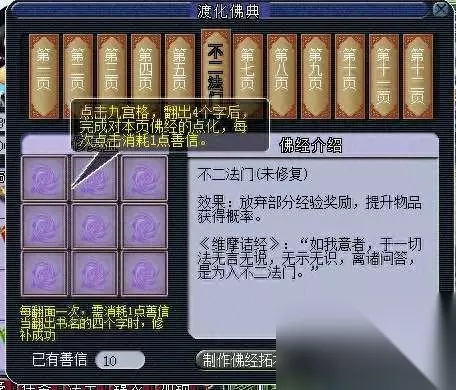 ,运气不好要九次才翻出来~ 每一本佛典翻完后都会得到十个拓本,点击“制作佛经拓本”可以制作出来,每个拓本都有不同的功能,而且拓本可以交易/摆摊,但是价格最高是9999哦 可以通过与其他玩家互换或直接从摊位上购买来增加自己的佛经