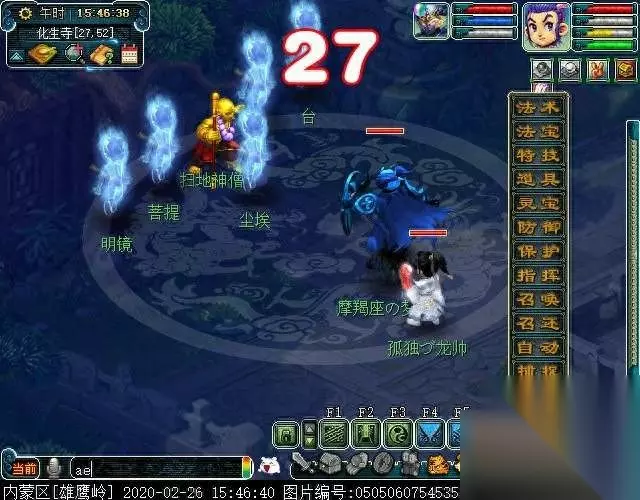 前十一本佛经收集齐后提示去化生寺找扫地僧(25,50)来获得第十二本佛经,需要与扫地僧战斗 战斗时只能使用物理攻击,怪物之间会相互复活,所以找到规律将其击杀,主怪会逃跑 树复活明镜,菩提复活树,尘埃复活台,尘埃复活菩提 第一回合可以先击杀树和明镜,第二回合击杀台和菩提,第三回合击杀尘埃