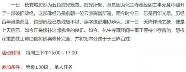 妙法慧心单人任务每周三下午3点,活动开始后,会在长安城(130,185)出现活动NPC-藏经阁主事