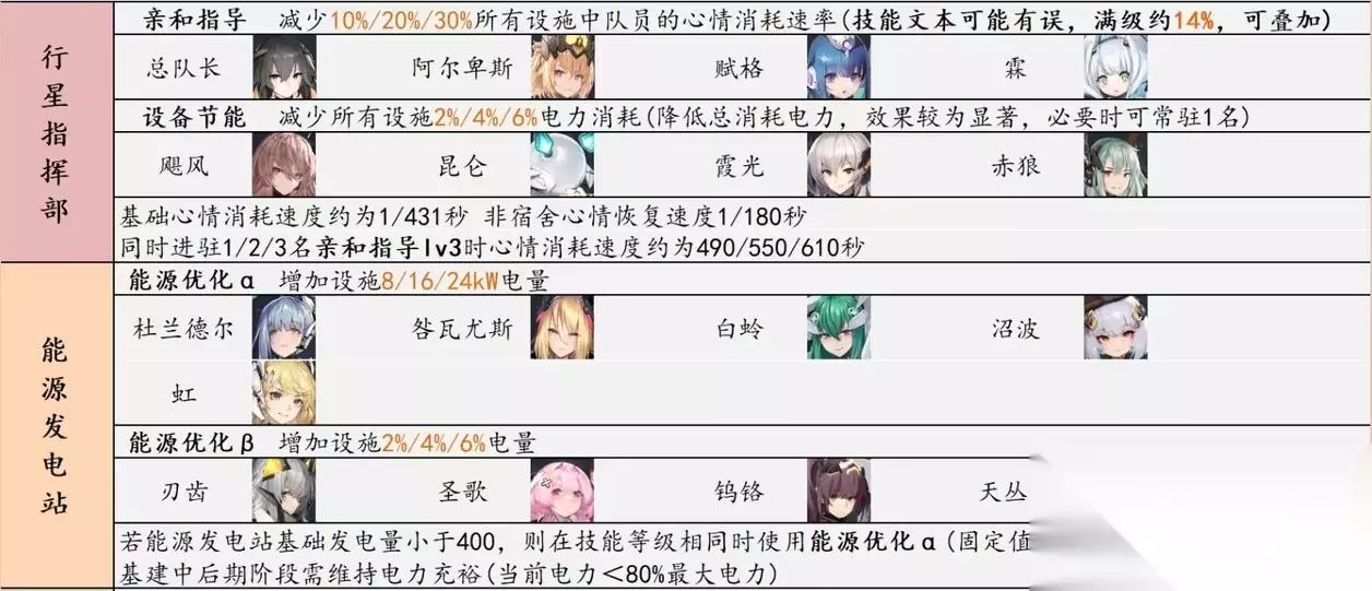 交错战线挖掘矿场怎么才能产能最大化 前言 1.电力充裕(在用功率低于总功率80%)时矿场效率提高20%; 2.好感度可提升基地技能,大于71为三级技能,本帖所讨论的技能皆只考虑三级技能; 一、电力计算 1. 除宿舍不产电、不耗电外,其余电力设施主要包括行星指挥部、能源发电站、挖掘矿场、合成工厂、原料交易所和研发中心,电力设施涉及电量均与等级相关。理论上来说发电设施级别越高,耗电设施级别越低,在用功率占总功率比例越低。但实际为了不影响设施功能,除研发中心外所有设施均应升级到10级满级,研发中心升级到7级即可解锁三个槽位,暂不清楚研发中心升到更高等级有何加成。因此,本帖讨论电力生产与消耗数值时,研发中心为7级,其余设施为满级。备注:原料交易所不升到满级也可以通过好友的订单完成交付,但由于后面的产能计算中即便原料交易所升到满级,最大产能时仍能保持电力充裕状态,所以从利人利己的角度,建议原料交易所升到满级。 2. 电力生产:行星指挥部720 能源发电站500=1220kW; 电力消耗:挖掘矿场440 合成工厂270 原料交易所190 研发中心150=1050kW; 行星指挥部和能源发电站通过改变驻员可降低电力消耗或提升发电量,英雄技能如下图所示: