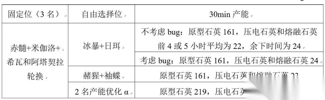 上阵3名产能优化α多产生21枚原型石英,折合2.69枚压电石英/熔融石英,同样还是推荐星椋/佩罗 赭猩 袖蝶 2名产能优化α。 综上所述,为获得最大产能挖掘矿场入驻英雄暂时推荐,赤髓 米伽洛 希瓦和阿塔契拉轮换 冰暴 日珥的组合,30min产能为原型石英161,压电石英和熔融石英23.38~24;上一组合回复心情时采用星椋/佩罗 赭猩 袖蝶 2名产能优化α,30min产能为原型石英156,压电石英和熔融石英16,上一组合心情回满时替换。根据我的宿舍情况,每天原型石英产能约为7698,压电石英/熔融石英1078~1104。计算中难免有疏忽的地方,如有问题请指正。 以上就是交错战线挖掘矿场产能最大化攻略的全部内容了,希望对各位玩家有所帮助,更多精彩游戏攻略和相关活动资讯请关注233乐园游戏。 转载请注明出处233乐园 » 交错战线挖掘矿场怎么才能产能最大化,交错战线挖掘矿场产能最大化攻略