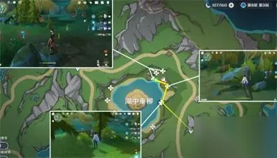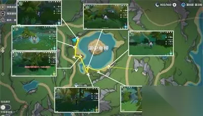 3.地图散落 我们在湖中垂柳的正下方下图的三个位置可以获得9个。