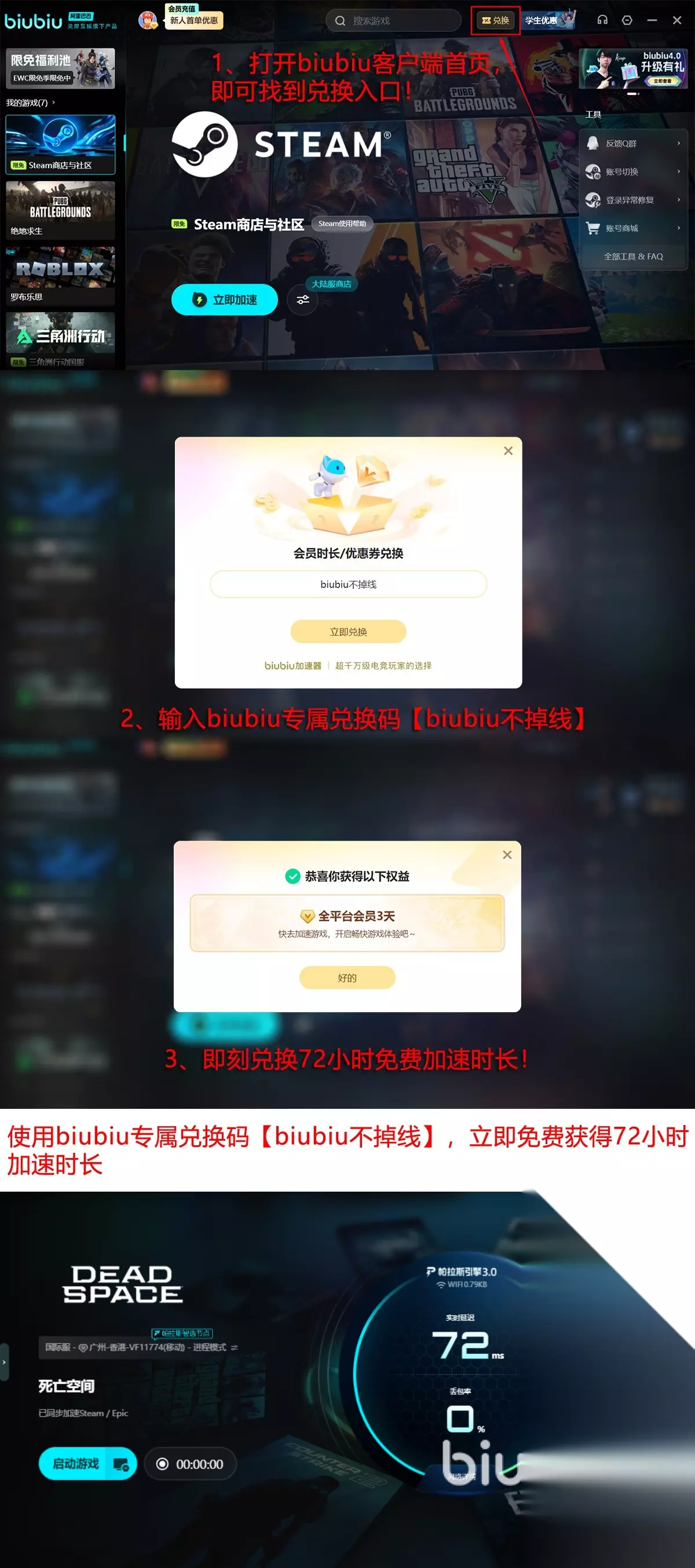 此时体验biubiu加速器,新用户专享厚礼即刻启程,注册成功之后自动获得首日24小时全功能免费试用权限,输入【biubiu不掉线】再额外获得72小时高级VIP加速时长,只需一个动作,新用户即可享受总计96小时的优质加速体验,零成本解决掉帧问题。