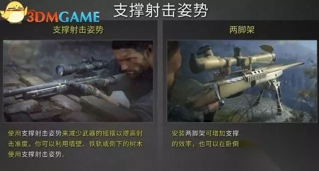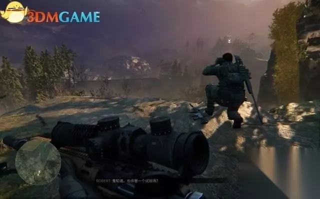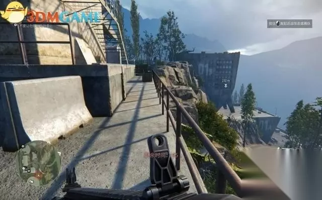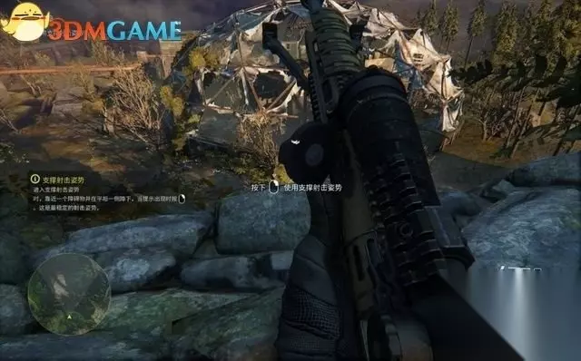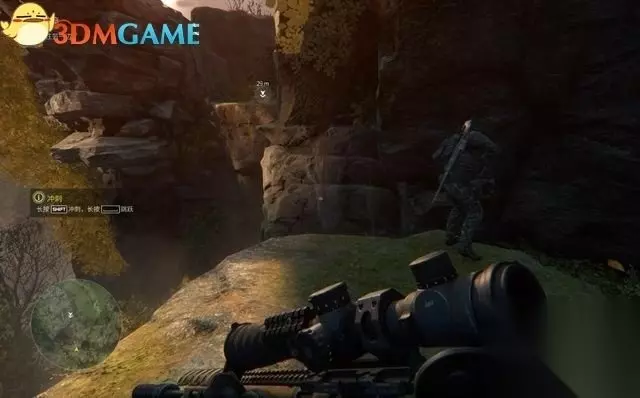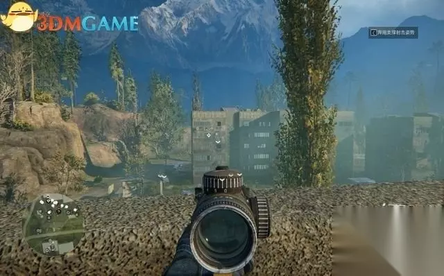 标记完成后,回到悬崖边。 此时学习使用支撑射击姿势,这种姿势可在固定的狙击点达成。靠近位置后出现提示,再按鼠标右键进入。