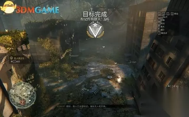 从罗伯特手中拿到无人机,开始侦察这座陈旧的穹顶建筑。 总共有标记6名敌人,有4名在地面,其余2名在高处平台。 从破损的缺口飞进穹顶建筑。标记时,无人机不能离敌人太近,或是进入敌人的视野,否则会被发现而任务失败。