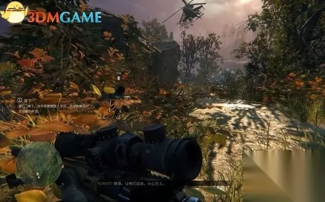往前遇到敌人的直升机,按C下蹲埋伏在草丛里,避免被发现。 下蹲姿势的脚步声轻微,不容易被敌人发现。 继续走遇到几只野兽在啃食腐尸,下蹲姿势穿过草丛,不要惊扰它们。