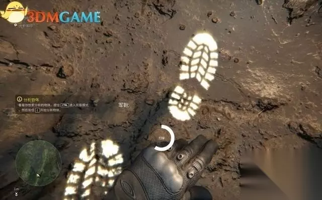 来到如图这里,罗伯特提示主角进行分析地上的脚印。 先按住Ctrl进入侦察模式,再朝着地上的脚印长按E,完成分析。