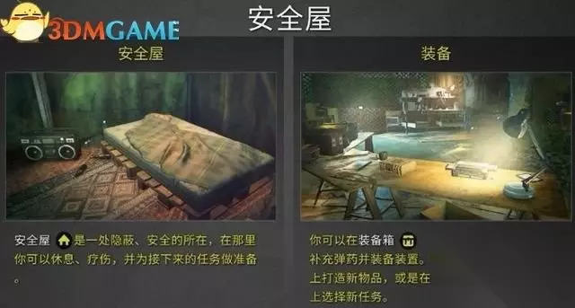 来到安全屋,熟悉一下各部分的功能。 装备箱:用来装备身上的武器和弹药,以及各种附加道具和装置。很多装备随着游戏的进程而逐渐解锁。