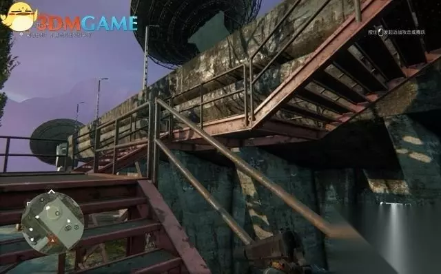 来到下层平台,清理掉这里的3名士兵。 第三座卫星天线就在平台的下方,这里有两条路线,往左你可以下楼梯,往右你可以下一条坡道。