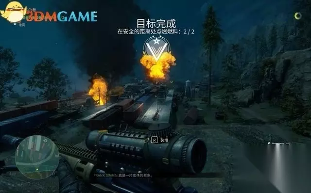 第二辆油罐车也差不多,需要先清掉天桥和迫击炮兵。 过去放掉第二个油罐的燃料,会刷出新任务:在安全距离处点燃燃料。