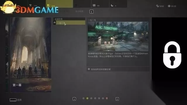 笔记本电脑:用来接取任务或是查看你收集到的情报。它是你的个人数据库。 在电脑界面,除了有主线章节和任务,还有角色介绍、可收集物品、统计数据等项目。 熟悉完安全屋,在电脑里选择做第一个主线任务“一石二鸟”。 第1幕:一石二鸟 说明:被通缉的俄罗斯军火贩子伊赫尔•扎伊采夫(Lgor Zaitsev)正在附近的一座加油站与阿尔森•科瓦奇(Arsen Kovac)会面。到山上等候他们的到来,干掉他们两个人。