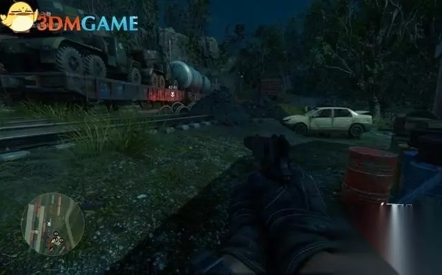 接下来要给两辆油罐车放掉燃料,沿铁路线先近后远。 首先需要清除远处天桥上的另一名哨兵,然后爬过铁轨,枪杀列车间的一名哨兵。 潜行过去转动阀门,放掉第一辆罐子的燃料。