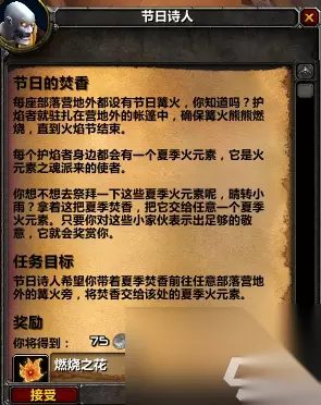 3、节日香 将节日诗人的夏日香带到任意阵营的篝火处完成,并获得有30%几率近战、远程或法术伤害造成700点火焰伤害的增益效果。