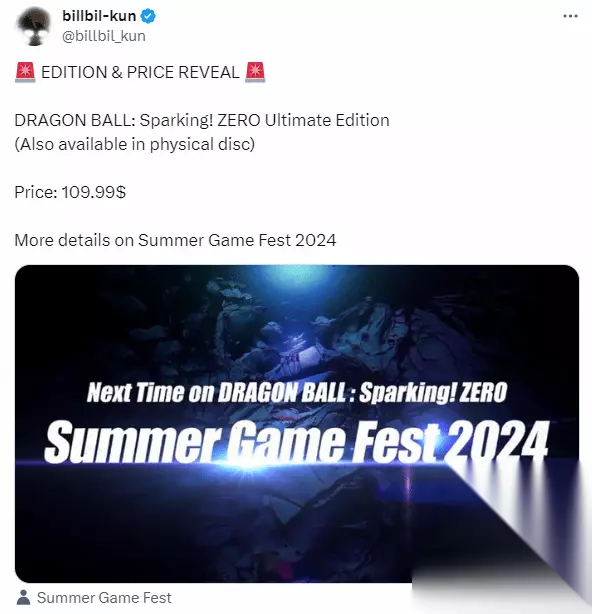 爆料人 billbil-kun 最新透露,《龙珠:电光火石 ZERO》终极版(包含实体光盘)的价格为 109.99 美元(约合 796 元人民币)。关于该游戏的更多细节将在本周的夏日游戏节上正式公布。