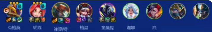 阵容 克格莫、妮蔻、卡牌、风女、洛、格温、奎桑提、凯南、石头人