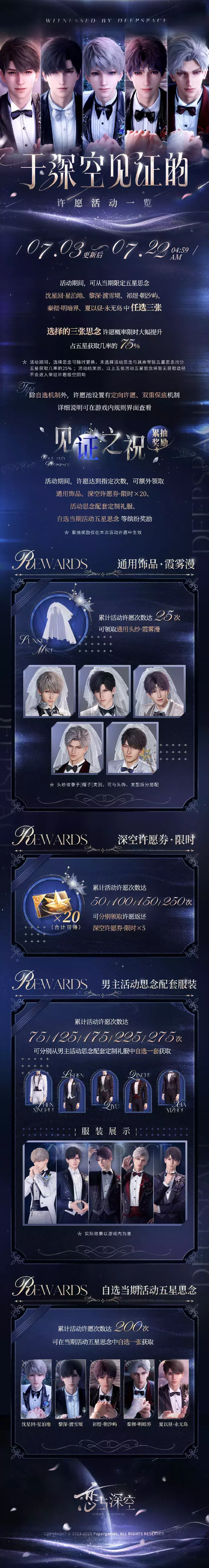 累计活动许愿达75、125、175、225、275次时,可分别从当期男主「活动思念配套定制礼服」中自选一套获取;