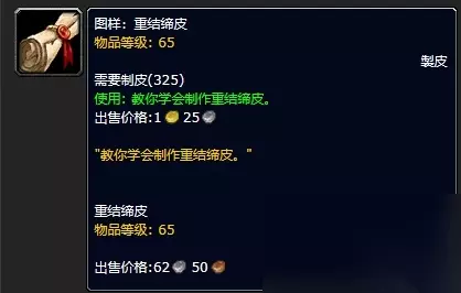 3、需要花费5金购买,物品等级为65,需要制皮325,使用后学会制作重结缔皮。