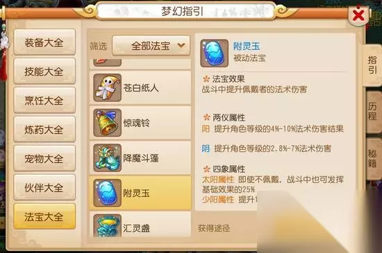 被动法宝是69级的核心选择,它们只要装备上就能持续生效。法系输出必带附灵玉,它能稳定提升灵力也就是法伤;物理系离不了飞剑,直接加物理伤害力。防御层面,金甲仙衣防点杀、降魔斗篷扛法伤,这两件几乎是通用保命装。要是你常用攻宠,九黎战鼓能拉高宝宝物理输出;带法宠就选汇灵盏增伤;卡速宠或龟速宠则适合盘龙壁加防。部分法宝的四象属性还能进一步微调效果,比如附灵玉的太阴属性加法爆几率,这就看个人追求爆发还是稳定了。