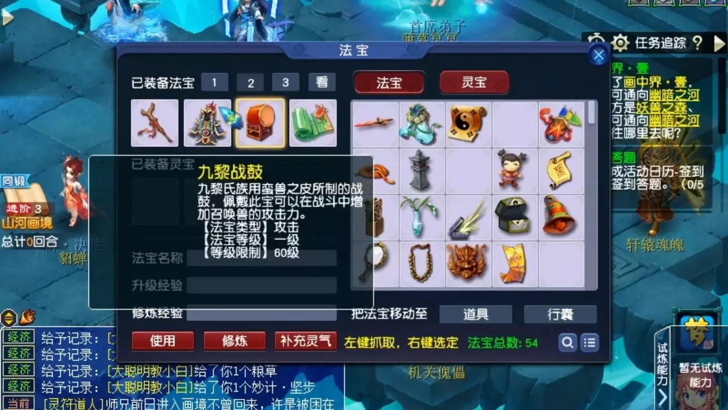 日常做师门、押镖、打帮派任务都有几率触发法宝任务,长寿郊外封妖也可能撞见。接到任务后按指引找NPC跑流程,凑齐材料交给天宫的金童子就能合成。直接用法宝任务书指定接想要的种类最省事。法宝到手只是第一步,修炼层数得靠经验慢慢喂上去,层数越高威力越足。用封妖、刷暗雷战斗时佩戴会自动补灵气,规划好刷场景就不必总花钱吃灵气丹了。物理系优先飞剑+金甲+九黎战鼓的组合就很实用,法系锁定附灵玉+斗篷+汇灵盏,辅助封系侧重金甲+斗篷+七宝玲珑灯解状态。法宝境界修炼耗经验,优先升主力法宝到高境界。