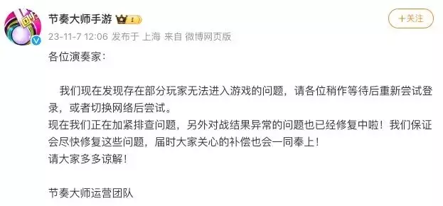 节奏大师回归进不去解决方法 答:切换网络重试,或者等官方修复。 详细说明: 1、节奏大师于2021年2月5日暂时下架,在2023年11月7日10点重新上线。 2、小伙伴们登录游戏遇到了无法进入的问题。 3、这可能是因为登录游戏的玩家太多或是网络不稳定。 4、可以尝试切换网络或过段时间再登录,避免高峰期。 5、官方也表示会进行排查问题,在第一时间对问题进行修复。 很多小伙伴不知道节奏大师回归进不去怎么办,其实我们可以尝试切换网络,重新登录游戏,目前官网也在进行紧急排查问题,详细的请多查看上方小编带来的解决方法。
