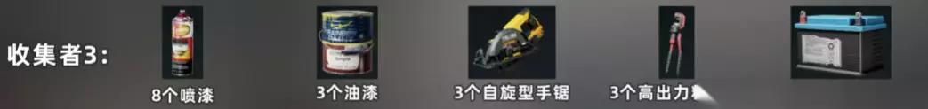 喷漆X8; 油漆X3; 自旋型手锯X3; 高出力粉碎钳X3; 电动车电池X2 收集者4: